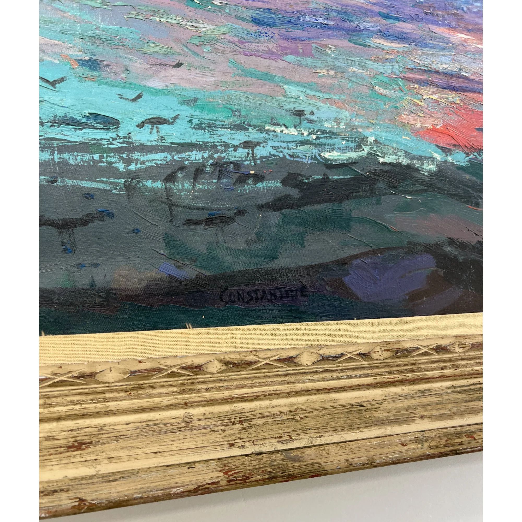 FINE ART sendprint Mid-century modern American oil on canvas painting of a sunset harbor scene in original frame signed lower left Constantine.Dimensions: 45" wide x 32" tallPrice: $4,900