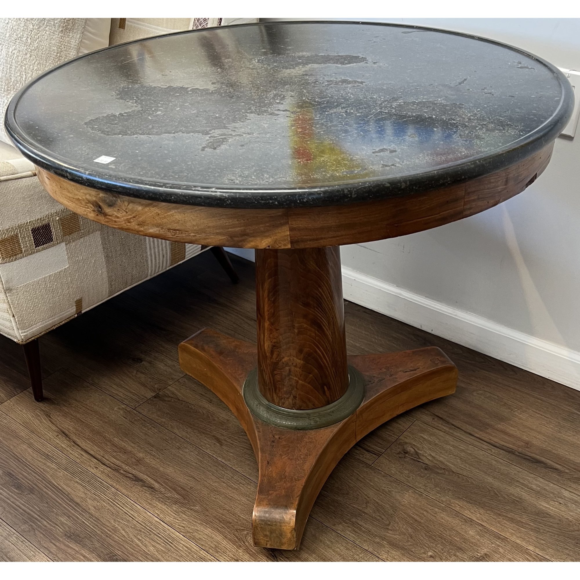 TABLES sendprint Gorgeous French late 19th century walnut pedestal table With black marble top and brass trim. Dimensions: 36" diameter 28" highPrice: $4,800